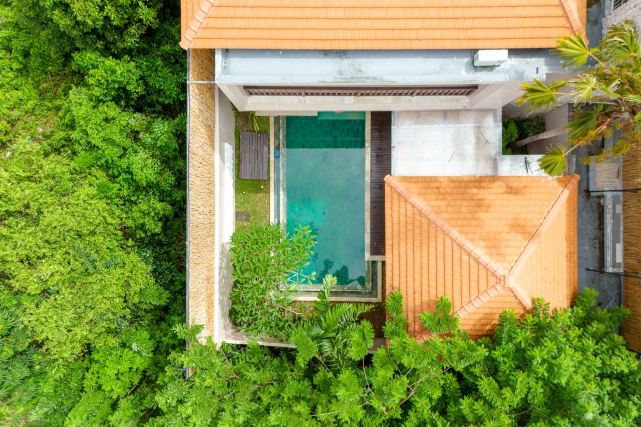 Upon entering, you’ll be welcomed by a lush tropical garden. To the right, nestled in a two-story building, are two elegantly designed bedrooms—one on the ground floor and the other upstairs—conveniently located next to the sparkling private pool. To the left of the entrance, the semi-open living room offers a breezy, tranquil space overlooking the lush garden, perfect for relaxing or spending quality time with loved ones. Adjacent to the living room is the master bedroom, complete with an ensuite bathroom featuring a cozy bathtub, creating a harmonious and inviting setting for relaxation.